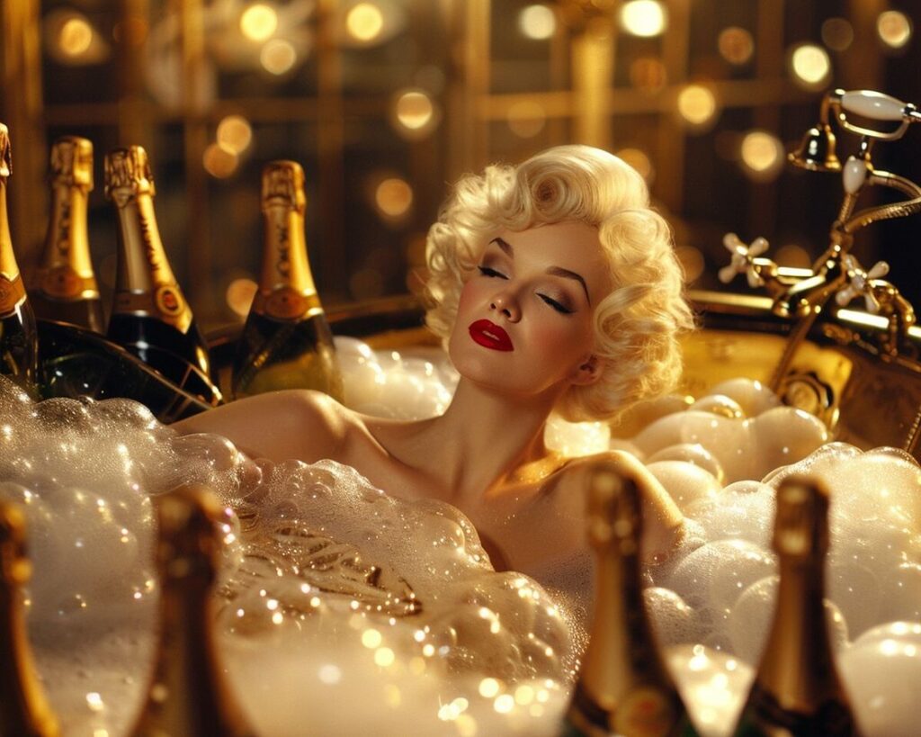 Priča se da je slavna glumica Marilyn Monroe jednom prilikom izlila u kadu 350 boca šampanjca i okupala se. Iako je riječ o popularnoj i glamuroznoj priči koja se često povezuje s njezinim raskošnim životnim stilom, ne postoji čvrst dokaz da se takvo nešto doista dogodilo.