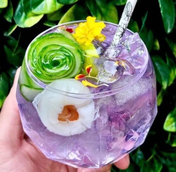 gin tonic plavi čaj (Butterfly Pea) svježi krastavac u obliku ruže (za ukras) limeta liči jestivi cvijet kadife Živjeli! ???