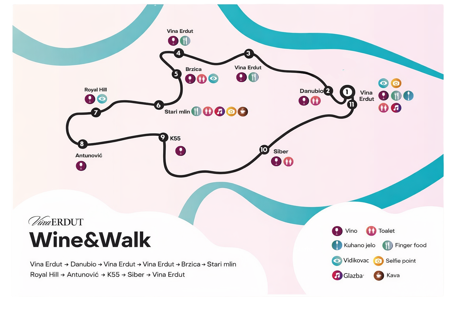 Program uključuje degustaciju pažljivo odabranih vina najistaknutijih vinarija Erdutske vinske ceste: Antunović, Brzica, Danubio, K55, Royal Hill, Siber i Vina Erdut. Vinske su postaje smještene u vinogradima i vinarijama, ondje gdje vino nastaje, dozrijeva i živi, a svaka se čaša prati pričom o terroiru, prostoru i ljudima koji stoje iza njega.